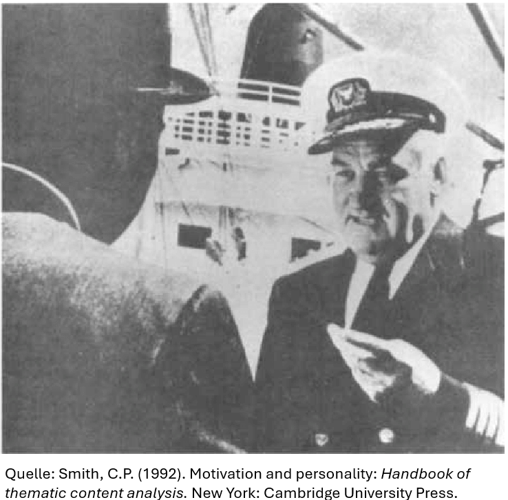 Der TAT beschreibt dabei ein Verfahren, bei dem die Teilnehmenden auf Basis unterschiedlicher Bilder, welche für kurze Zeit dargeboten werden, eine kreative Geschichte entwickeln sollen. Die entwickelten Geschichten werden analysiert und dienen dazu, unbewusste Motive der Person aufzudecken und zu beschreiben (Morgan & Murray, 1935). Abbildung 2 zeigt ein typisches Bild für die TAT-Messung des Einflussmotivs nach Smith (1992). Aussagen wie „Der Kapitän erklärt dem Gegenüber, wie er die Schiffsreise plant“ würden für die Annäherungskomponente im Einflussmotiv stehen. Ein Kommentar wie „Der Kapitän muss sich vor dem Eigner für seine Fehler rechtfertigen“ für die Vermeidungstendenz. Der Charme dieser projektiven Messung impliziter Motive liegt darin, dass sozial erwünschte Antworten der Teilnehmenden weniger häufig auftreten, da sie stärker intransparent ist.